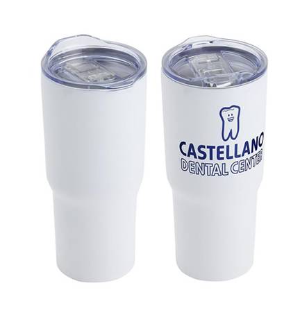 Clear plastic push-on lid with sliding drink opening. The double wall insulation keeps your drink hot or cold for up to 12 hours. Tapered bottom fits most car cup-holders.